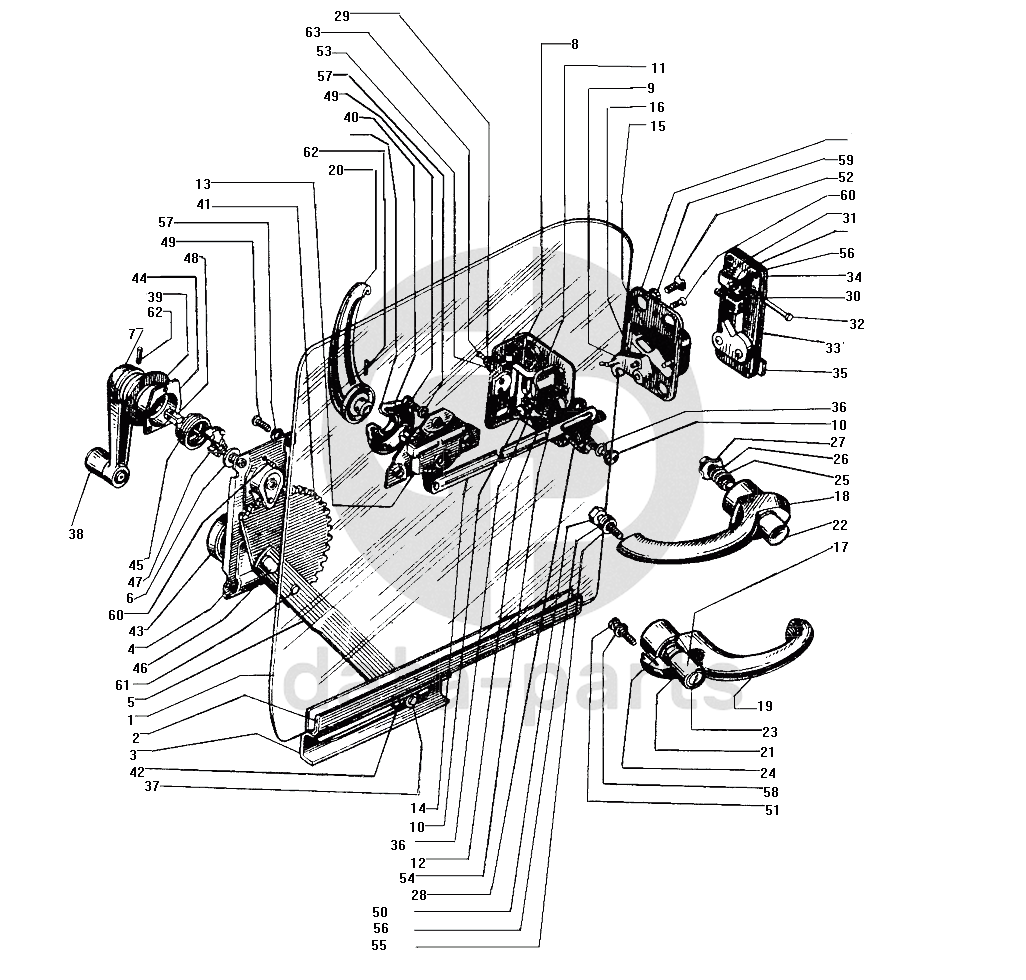 Замок, ручки и стеклоподъемник двери
