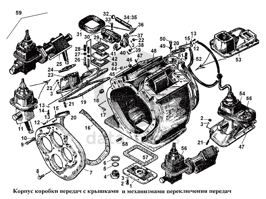 Корпус коробки передач с крышками и механизмами переключения передач Т-170